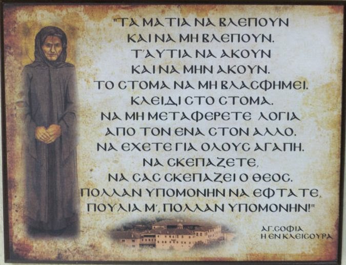 * Να είστουνε καλά. Χαράν να έσετε! -Να μετανοάτε, παιδία μου... Να εύτάτε προσευχήν... Νύχταν και ήμέραν... οπού πορπατείτε, οπού εύρίουστουν, οπού στέκουστουν, πάντα να λέτε «Χριστέ μ', να έλεήσ' με! Με γλυκόν γλώσσαν να μιλάτε με τον Θεόν, να φτάτε προσευχήν».